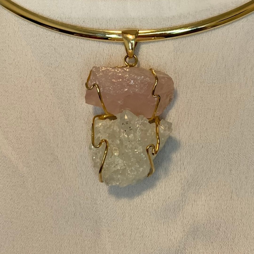 Colar Choker Drusa de Cristal e Quartzo Rosa  Bruto em Banhado a Ouro são frequentemente associados a diversas propriedades de proteção energética.