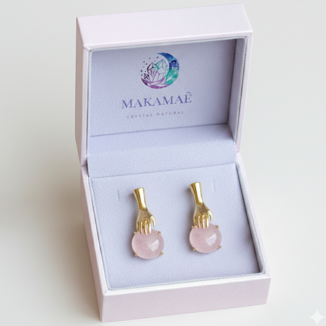 Descubra a beleza natural e o equilíbrio emocional com o Brinco Quartzo Bruto Rosa Banhado Ouro - Maozinha segurando a pedra- Ponta Biterminada da Loja Makamar Cristais. Cada peça é uma expressão única do quartzo rosa em sua forma bruta, realçada pelo banho de ouro que adiciona um toque de elegância e sofisticação.