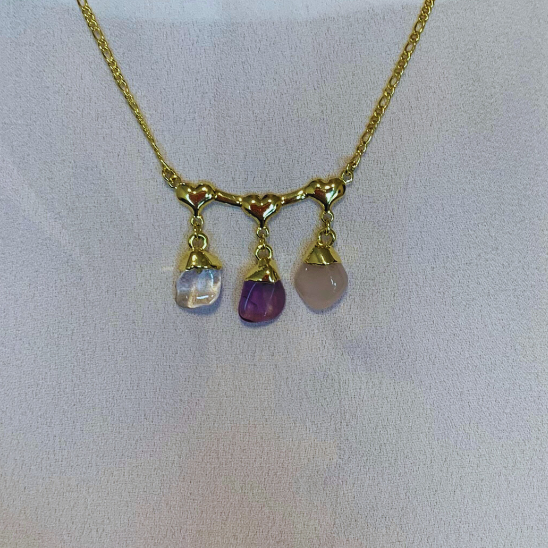 Descubra a beleza natural e o equilíbrio emocional com o Colar de 3 Pedra Quartzo rosa, Roxo e Cristal corrente Banhado Ouro - Ponta Biterminada da Loja Makamar Cristais. Cada peça é uma expressão única do quartzo rosa em sua forma bruta, realçada pelo banho de ouro que adiciona um toque de elegância e sofisticação.